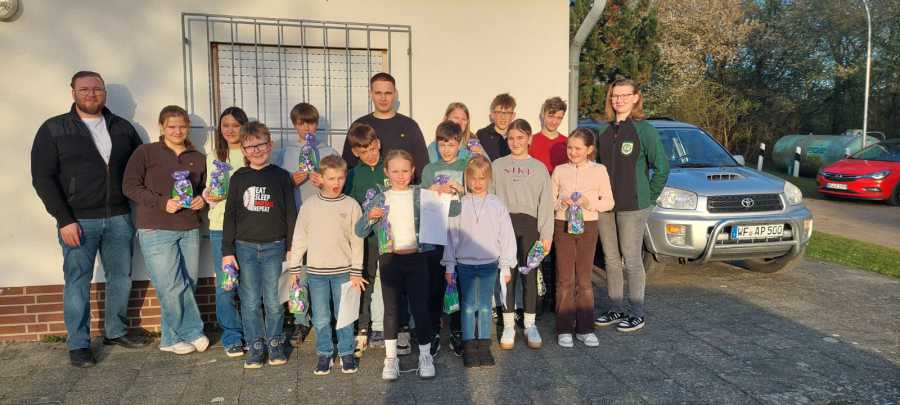 Am Mittwoch den 08.04.2026 fand das diesjährige Osterpreisschießen der Jugend im Schützenheim statt. Am Ende konnte sich jeder Jugendliche über eine Ostertüte freuen. Auf dem Bild sehen sie die Jugendliche und links Rene Reiners und rechts Lena Reiners die sich wie immer um die Jugend gekümmert haben. Herzlichen Glückwunsch dazu vom Vorstand.