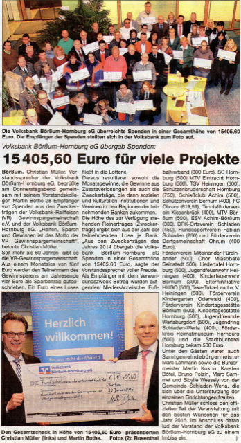 Spendenvergabe an den Vereinen der Samtgemeinde Oderwald. Volksbank Börßum/Hornburg. Schaufenster 25.01.2015